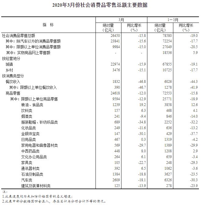 按經(jīng)營單位所在地分,3月份,城鎮(zhèn)消費品零售額22974億元,同比下降15.9%,降幅比1-2月份收窄4.8個百分點;鄉(xiāng)村消費品零售額3476億元,下降15.1%,降幅比1-2月份收窄3.9個百分點。1-3月份,城鎮(zhèn)消費品零售額67855億元,同比下降19.1%;鄉(xiāng)村消費品零售額10725億元,下降17.7%。