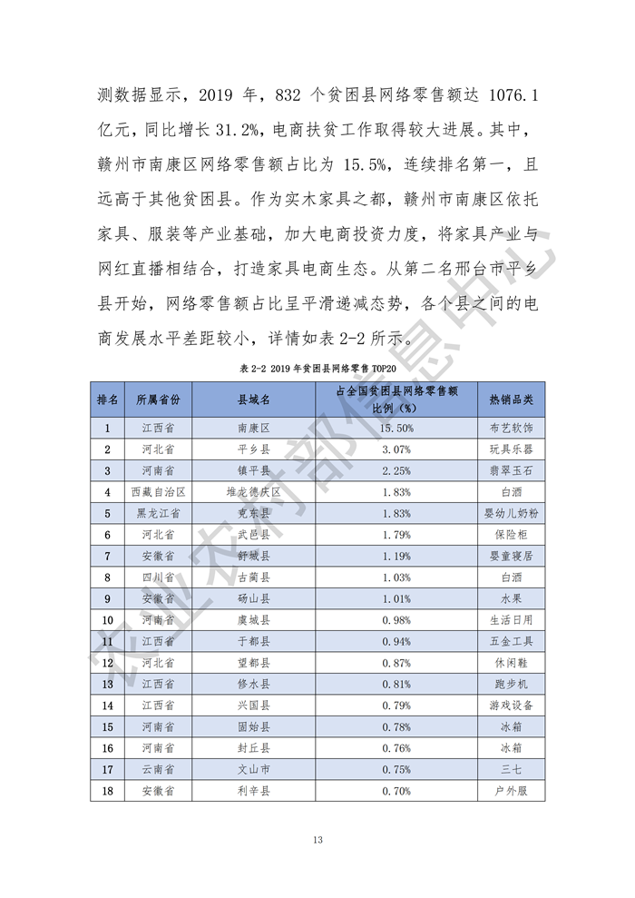 發(fā)布會指出,2019年全國2083個縣域網(wǎng)絡零售額達30961.6億元,同比增長23.5%,其中832個貧困縣網(wǎng)絡零售額達1076.1億元,同比增長31.2%;縣域農(nóng)產(chǎn)品網(wǎng)絡零售額達2693.1億元,同比增長28.5%,其中832個貧困縣農(nóng)產(chǎn)品網(wǎng)絡零售額為190.8億元,同比增長23.9%,需求側的數(shù)據(jù)、信息日益成為供給側結構性改革的新動能,農(nóng)業(yè)的產(chǎn)業(yè)鏈、供應鏈、創(chuàng)新鏈、價值鏈正在加速重構,電子商務成為“綠水青山就是金山銀山”的重要“轉換器”。