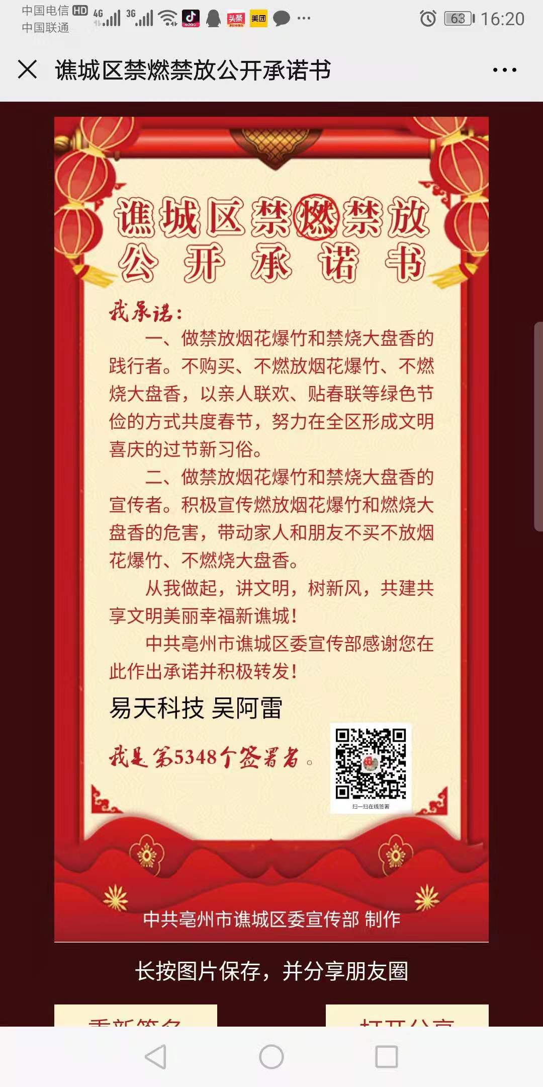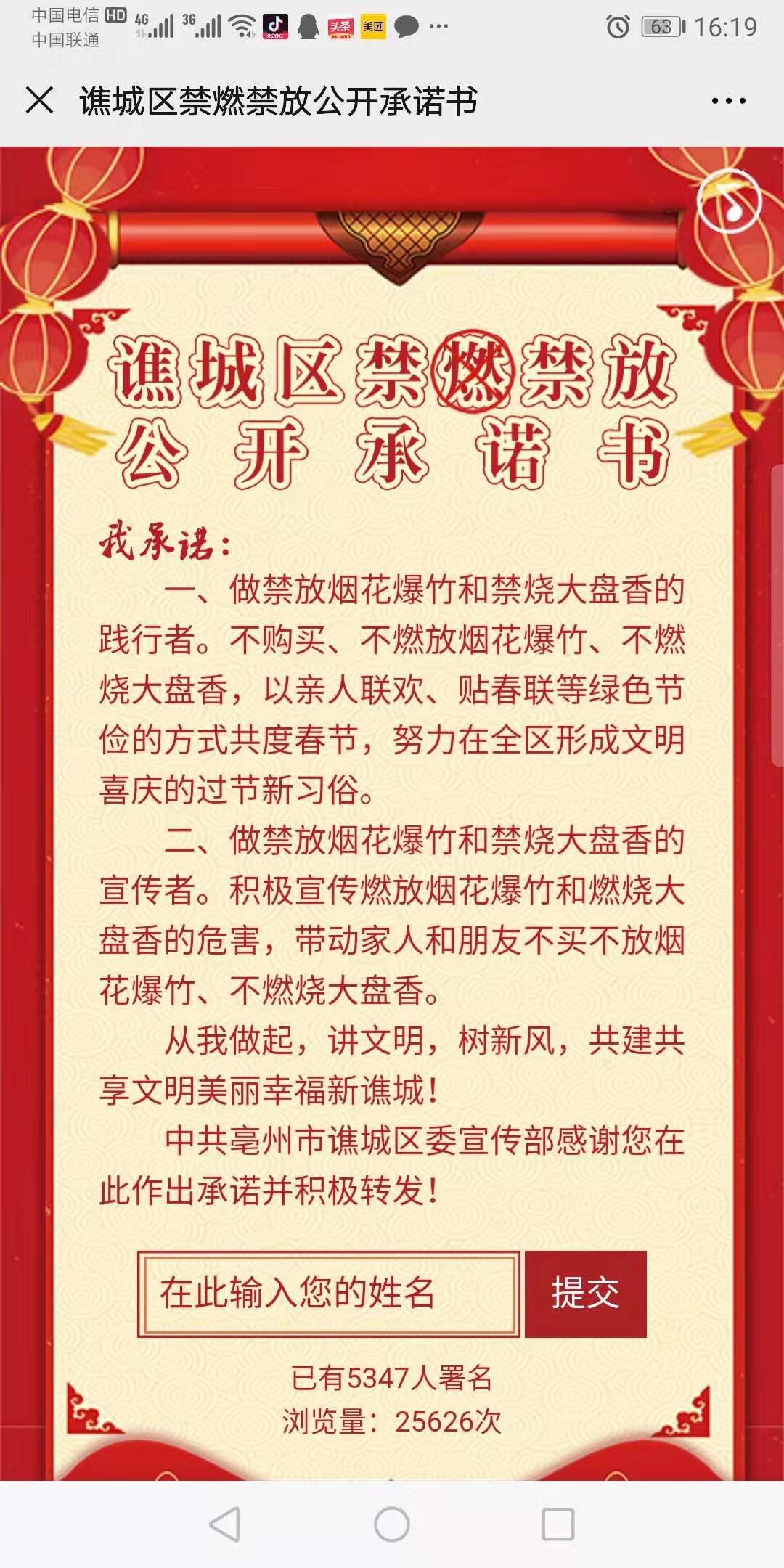 譙城區(qū)禁燃禁放公開承諾書我承諾:一、做禁放煙花爆竹和禁燒大盤香的踐行者。不購買、不燃放煙花爆竹、不燃燒大盤香,以親人聯(lián)歡、貼春聯(lián)等綠色節(jié)儉的方式共度春節(jié),努力在全區(qū)形成文明喜慶的過節(jié)新習(xí)俗。二、做禁放煙花爆竹和禁燒大盤香的宣傳者。積極宣傳燃放煙花爆竹和燃燒大盤香的危害,帶動(dòng)家人和朋友不買不放煙花爆竹、不燃燒大盤香。從我做起,講文明,樹新風(fēng),共建共享文明美麗幸福新譙城!譙城區(qū)委宣傳部感謝您在此作出承諾并積極轉(zhuǎn)發(fā)??